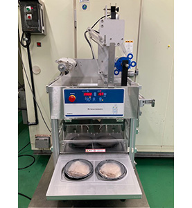 容器は、冷凍し電子レンジ対応容器(温めても外側が高温にならないタイプ)。機械は、生産能力に適したトップシール機とフィルムを提案。