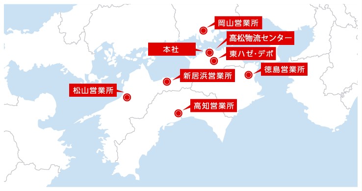 タニモトの本部は高松市に、営業所は四国4県と岡山県の計6か所にあります。全拠点に商品のストックヤードを完備し、取り扱い点数は数万点にも及びます。
