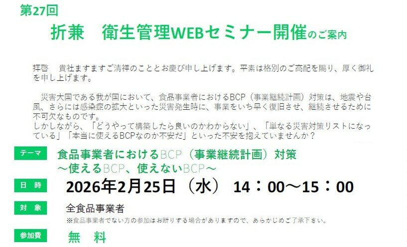 第27回折兼 衛生管理WEBセミナー開催のお知らせ