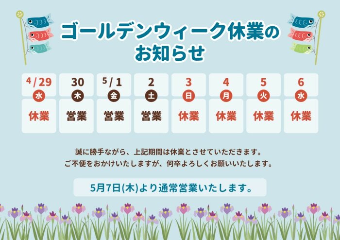 ゴールデンウィーク休業のお知らせ 2026.04.20 平素は格別のお引き立てを賜り厚くお礼申し上げます。 誠に勝手ながら、下記日程をゴールデンウィーク休業とさせていただきます。 休業期間中に頂いたHPへのお問い合わせにつきましては、営業開始日以降に順次回答させていただきます。 お客様にはご不便をお掛けいたしますが、何卒ご理解いただきますようお願い申し上げます。 facebook twitter line