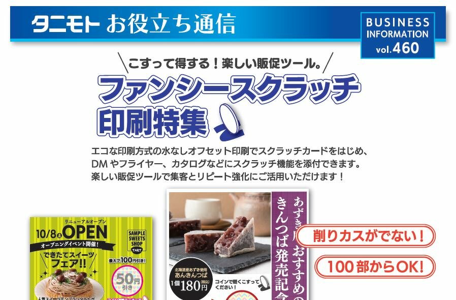 お役立ち通信 vol.460 ファンシースクラッチ印刷特集 2022.03.02 お役立ち ファンシースクラッチ印刷特集 DMやカード、ちらし、カタログなどにスクラッチ機能を添付できます。 楽しい販促ツールで集客とリピート強化にご活用できます。 【特徴】 ・100部からOK ・削らないのでカスがでない コインでこすってもカスがでないため飲食店などでも衛生的に ご利用いただけます。 ・地紋を選べます 24種類の地紋の中からお好きなものをお選びください。 ※詳しくはこちらから facebook twitter line